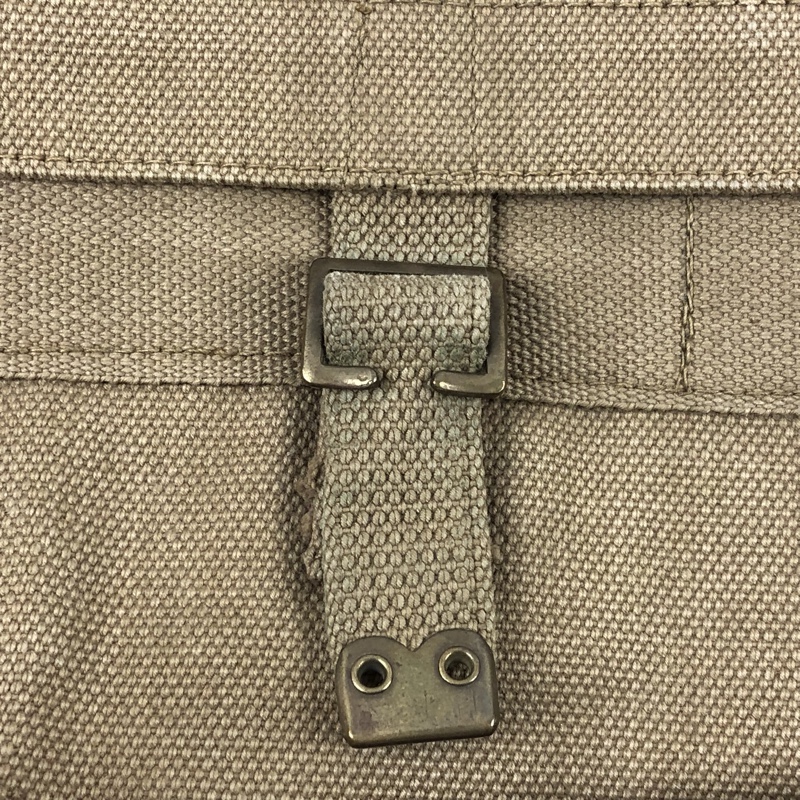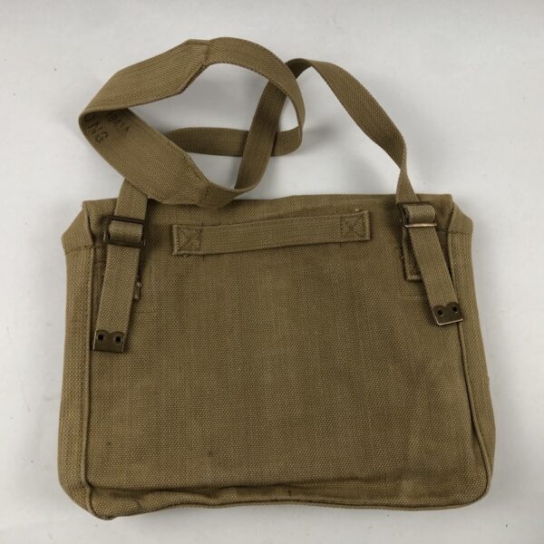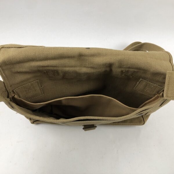 Bolso auxiliar con correa en la parte superior para llevar al hombro y cierre mediante una solapa con correa. fabricado en lona gruesa sin ningún tipo de desperfecto ni desgaste, como nuevo, probablemente sin uso pese a sus más de 80 años. Excelente marcajes de 1943 en el mismo, perfectamente visibles.