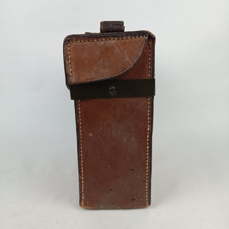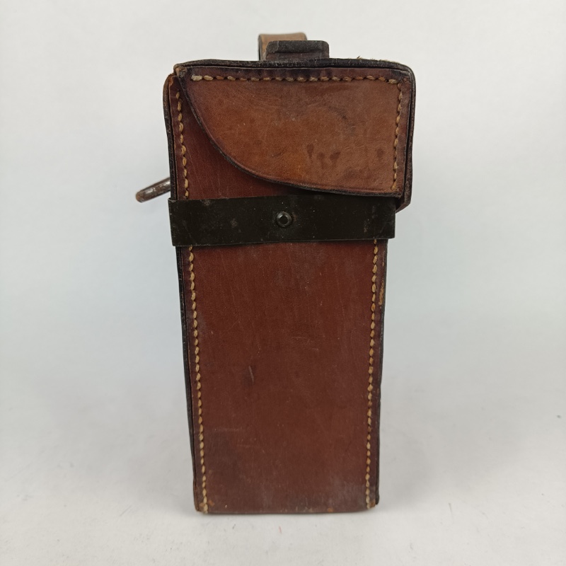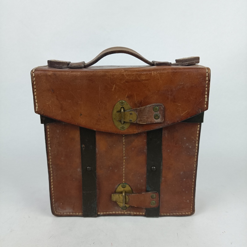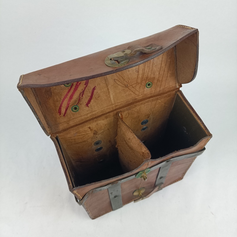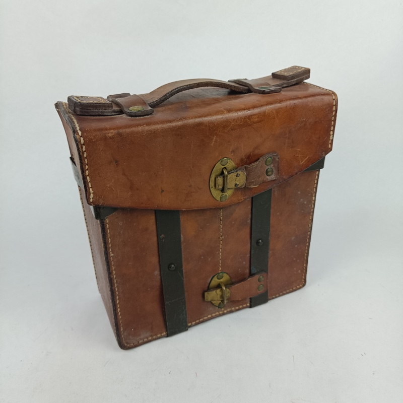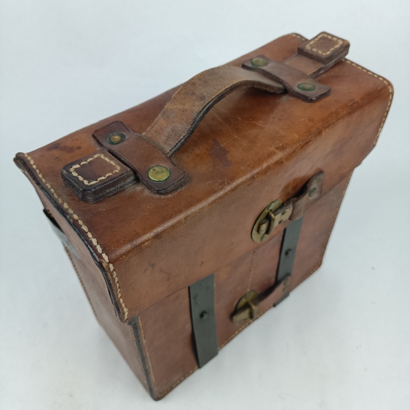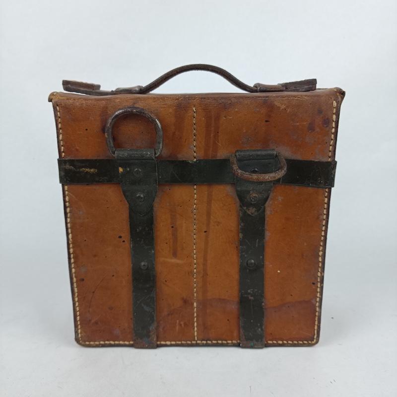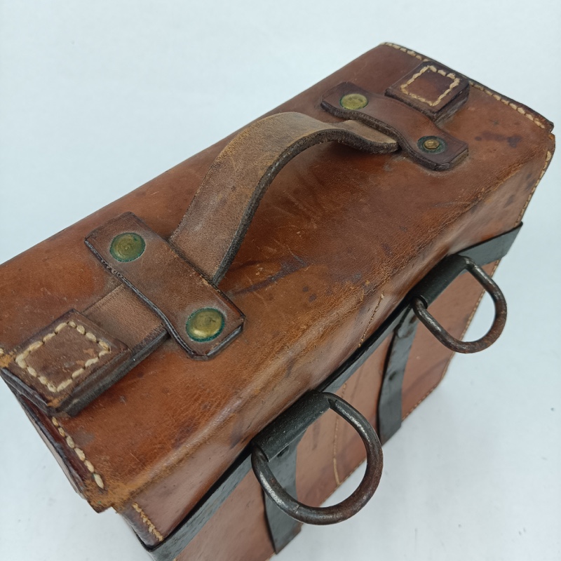 Maletín militar fabricado en cuero grueso de color marrón, con herrajes, anillas laterales y cierres metálicos. Presenta asa superior reforzada y estructura rígida, con interior compartimentado mediante separador central, diseñado para el transporte de munición, cargadores o accesorios militares.
