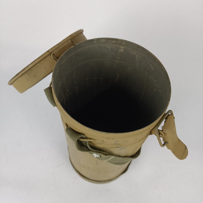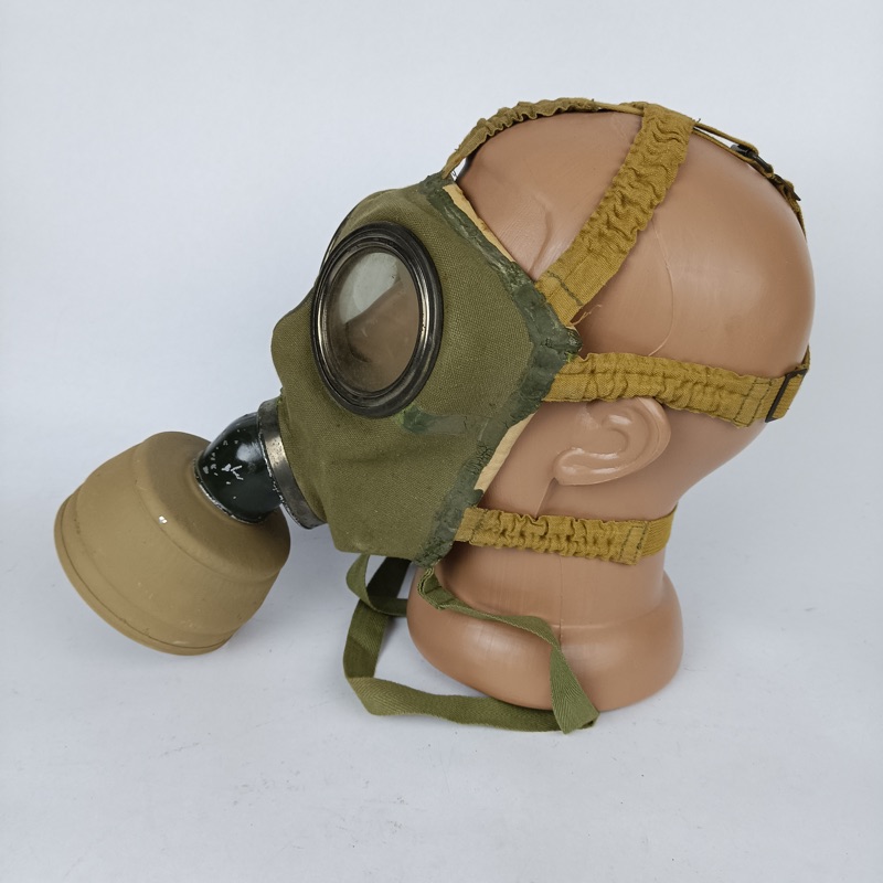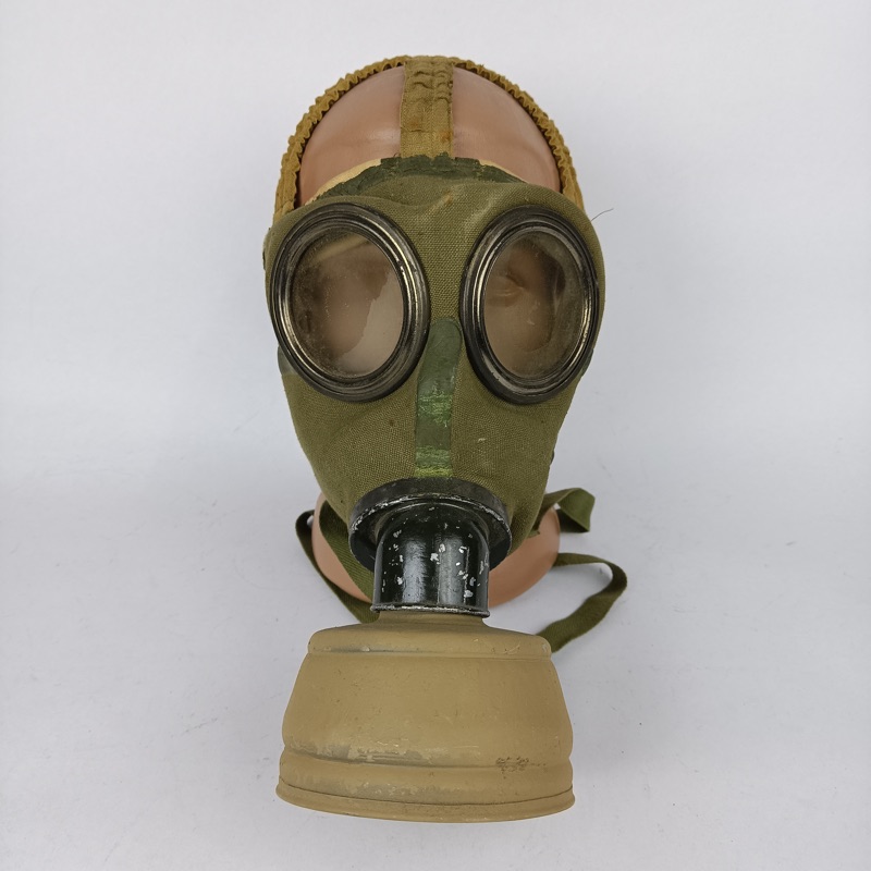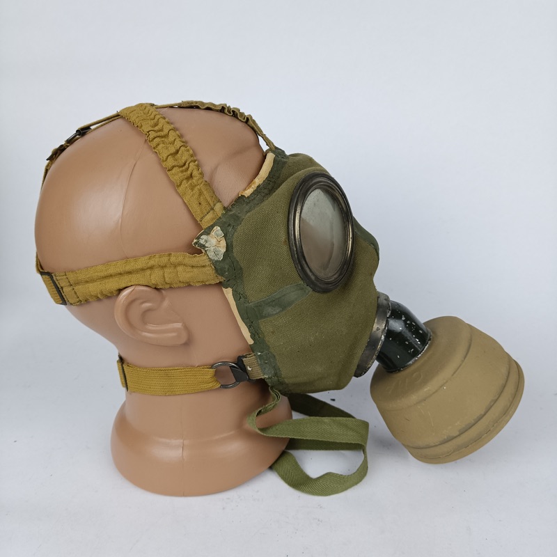 Mascara original del ejercito Español, fabricada en los años 40 y 50, prácticamente idéntica a los modelos Alemanes que llegaron durante la Guerra Civil y que Alemania uso en la Segunda Guerra Mundial. Conjunto completamente original, con bote repintado y envejecido.