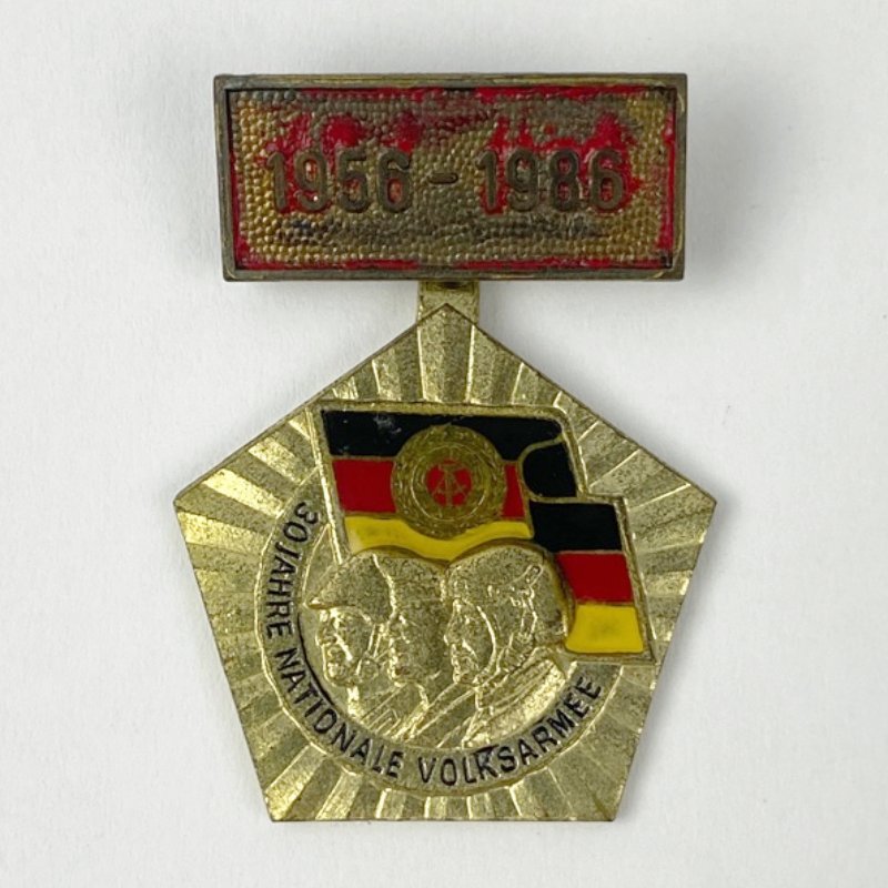 Anverso en forma pentagonal con relieve central de dos perfiles de soldados, bandera esmaltada de la RDA y la inscripción “30 JAHRE NATIONALE VOLKSARMEE”. Barra superior con fechas “1956–1986”.