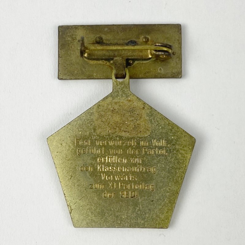 Reverso con inscripción en alemán “Firmemente arraigados en el pueblo, guiados por el Partido, cumplimos el mandato de clase. ¡Adelante hacia el XI Congreso del SED! (Sozialistische Einheitspartei Deutschlands)”.