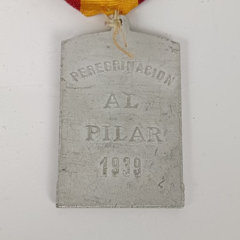 Medalla conmemorativa de peregrinación al Pilar fechada en 1939. Pieza metálica con cinta en colores rojo y amarillo, anverso con representación religiosa y reverso con inscripción “Peregrinación al Pilar 1939”.