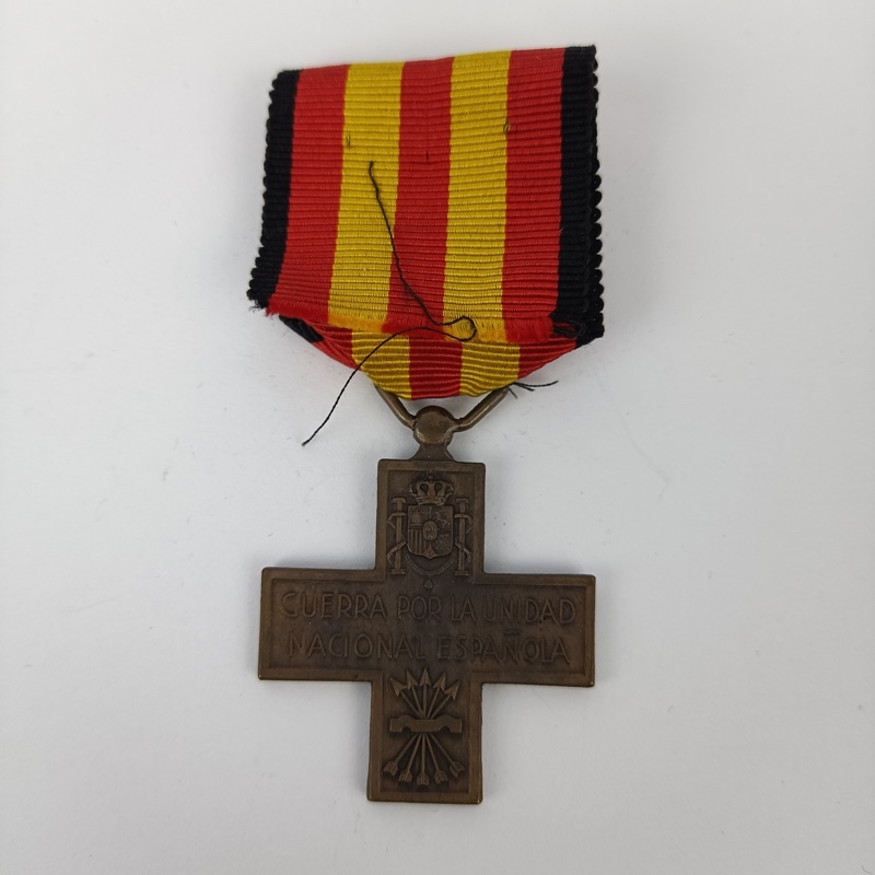 Cruz de bronce con una espada y la fecha 17 de Julio de. 1936 en la parte superior. En el reverso se lee la inscripción “Guerra por la Unidad Nacional Española”.