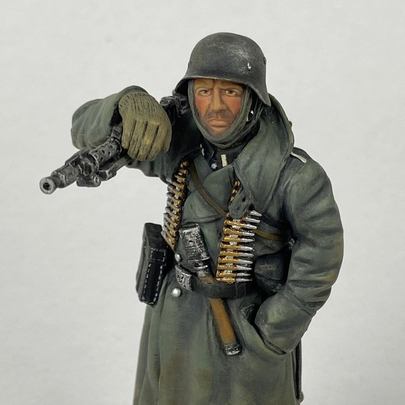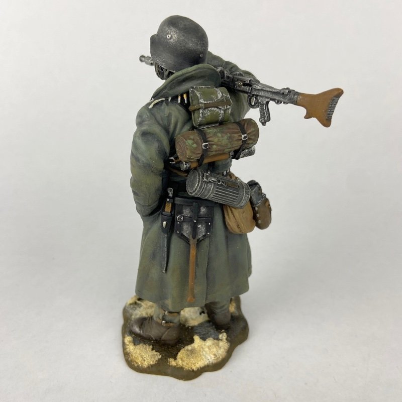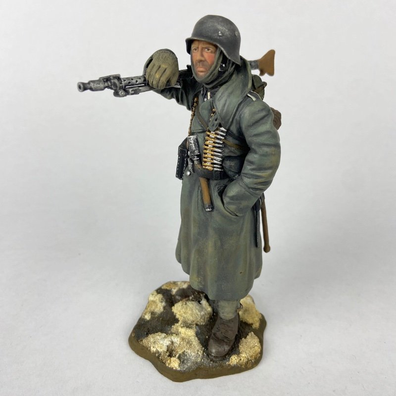 Miniatura a escala 1:16 o 120 mm aproximadamente, que representa a un sirviente de ametralladora MG34 del Ejército Alemán (Heer) durante la Operación Barbarroja, en el frente oriental durante el invierno de 1941–1942. La figura viste abrigo largo de invierno y casco de acero, con triángulo de combate en la espalda.