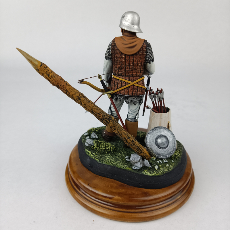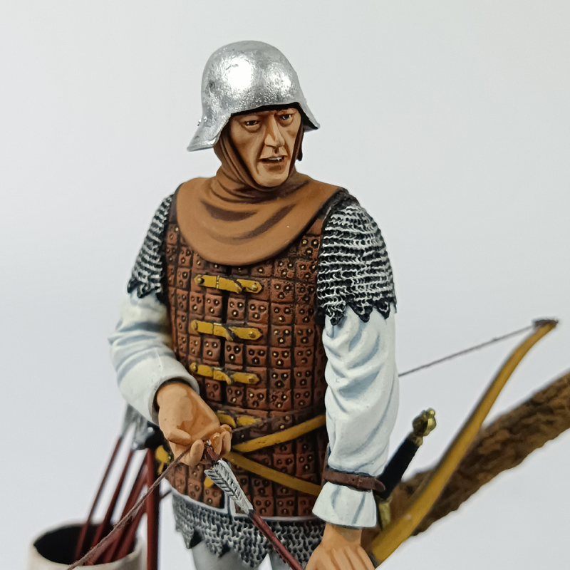 Miniatura a escala 1:18 o 90 mm aproximadamente, que representa a un arquero inglés del siglo XV, hacia el año 1475. La figura viste brigantina remachada sobre cota de malla, casco metálico sencillo y vestimenta típica de los arqueros ingleses tardomedievales. Porta arco largo tipo longbow con flecha preparada, carcaj con proyectiles y espada corta al cinto como arma secundaria.