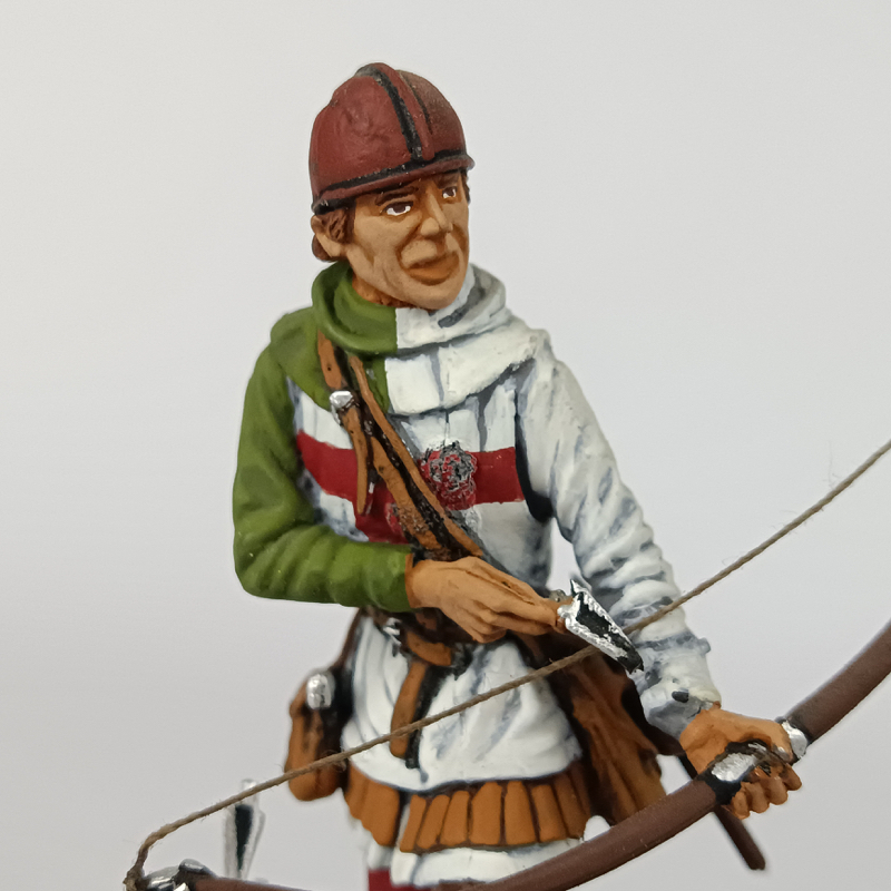 La figura muestra a un arquero con casco sencillo y vestimenta característica de infantería inglesa del siglo XIV, destacando la sobrevesta con cruz roja sobre fondo claro, asociada a las tropas inglesas del periodo. Porta arco largo en posición de disparo y equipo auxiliar propio de los arqueros medievales, como daga y bolsa de útiles. La base escénica simula terreno irregular propio de un campo de batalla medieval.
