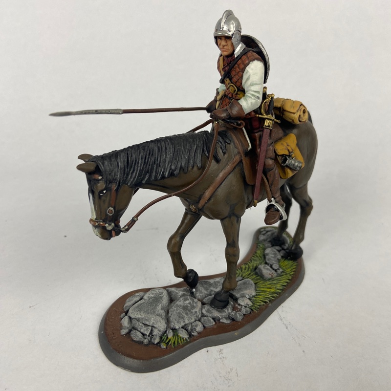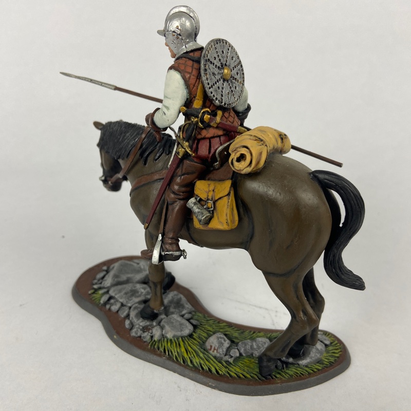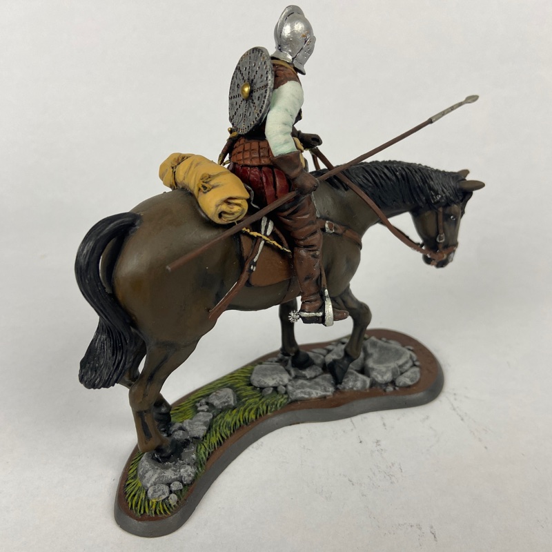Miniatura a escala 1:20 o 80 mm aproximadamente, que representa a un jinete Border Reiver de finales del siglo XVI, guerrero fronterizo típico de las regiones entre Inglaterra y Escocia. La figura muestra al jinete equipado con casco metálico tipo burgonet, chaleco acolchado, lanza larga de caballería y escudo circular sujeto a la espalda. El caballo aparece completamente equipado con montura, alforjas y equipo de campaña, característico de estos combatientes fronterizos.