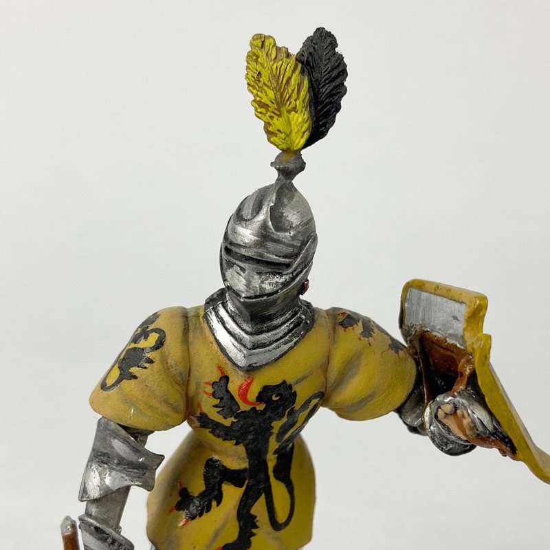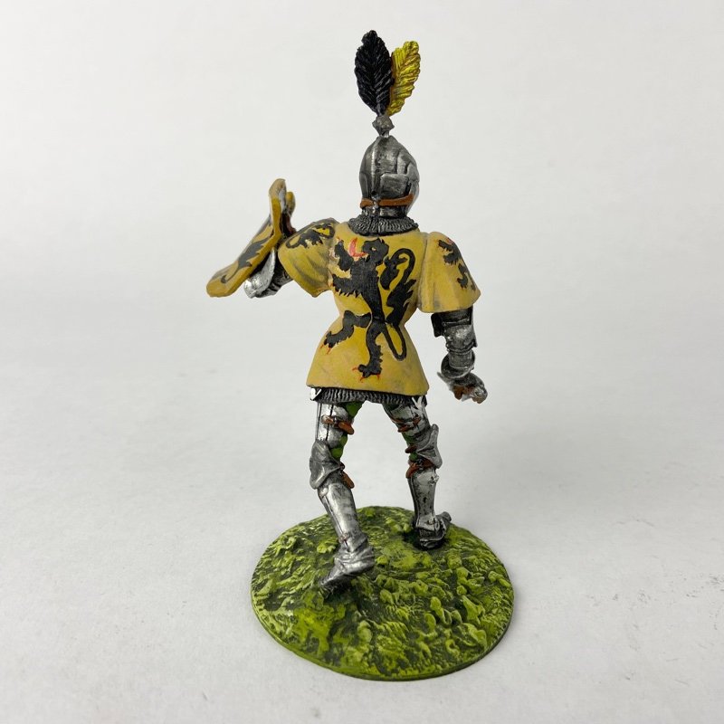 La figura muestra a un caballero armado con lanza y escudo heráldico, vistiendo sobrevesta amarilla decorada con león rampante negro y detalles heráldicos visibles tanto en el pecho como en la espalda. Porta casco cerrado con penacho bicolor, característico de caballería pesada del periodo. La base escénica reproduce terreno herboso sencillo que realza la presencia de la figura.