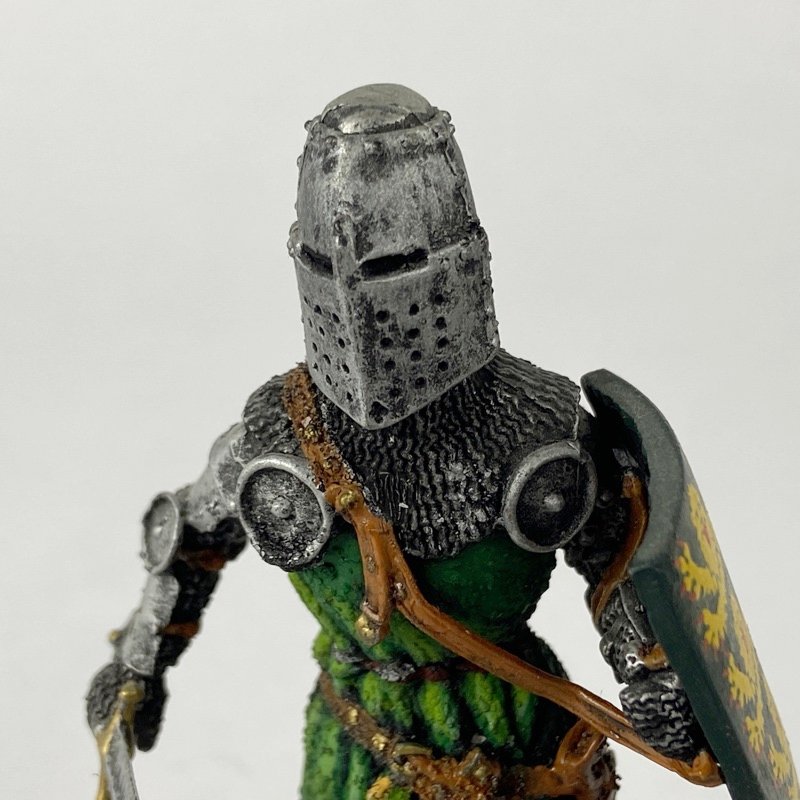 La figura muestra a un caballero equipado con yelmo, cota de malla completa y protecciones metálicas en hombros y extremidades. Viste sobrevesta en color verde sobre la armadura y porta escudo heráldico triangular y espada recta. Este tipo de equipo era característico de la caballería pesada inglesa durante campañas en territorio escocés a comienzos del siglo XIV. La base escénica representa terreno irregular propio de campo de batalla medieval.