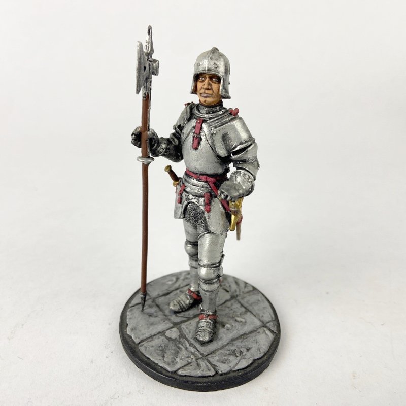 La figura muestra armadura completa con peto, espaldar, hombreras y protecciones articuladas en brazos y piernas, junto a casco de tipo celada propio del periodo. Porta espada al cinto como arma secundaria y sostiene un arma de asta tipo alabarda, con hoja lateral y punta superior, utilizada ampliamente por tropas de infantería pesada y guardias durante el final del periodo medieval. La base escénica representa pavimento de piedra, aportando un contexto urbano o de fortificación.