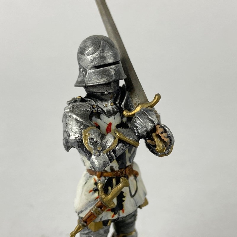 Destaca el buen nivel de acabado de la pintura realizada a mano, con tratamiento realista del metal en la armadura, detalles en las correas y armas, y buen trabajo en la decoración de la sobrevesta. El conjunto presenta un acabado equilibrado que resalta el carácter histórico de la pieza.