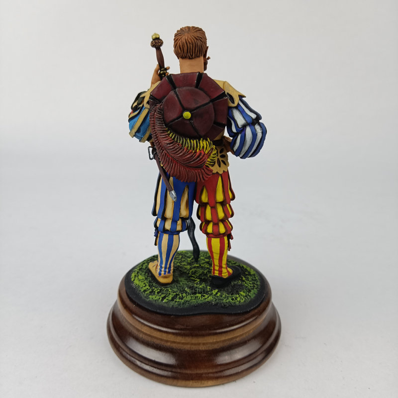 La figura aparece en posición firme, con abundantes detalles en la vestimenta, correajes y armamento, así como en los elementos decorativos propios de los lansquenetes. Destaca el escudo circular en la espalda y la riqueza cromática del uniforme, muy representativa de estas tropas mercenarias del periodo.