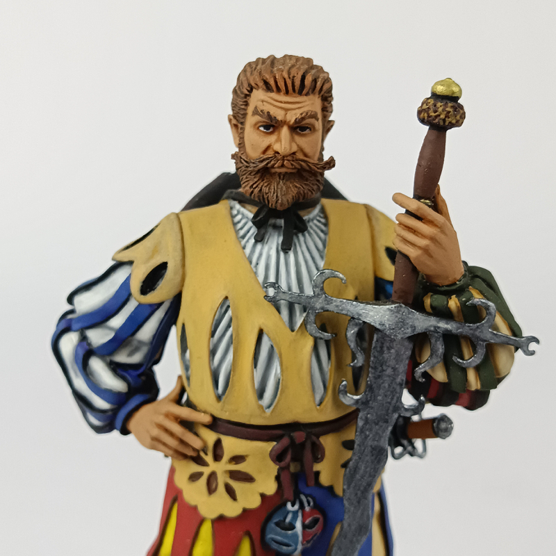 Miniatura a escala 90 mm (1:18) que representa a un Doppelsöldner lansquenete alemán del siglo XVI, hacia el año 1520. La figura viste indumentaria típica renacentista con jubón y calzas multicolores, mangas acuchilladas y armamento característico, incluyendo espada y gran espada tipo Zweihänder asociada a este tipo de combatientes veteranos.