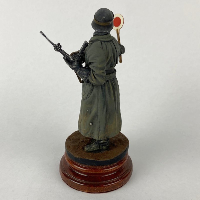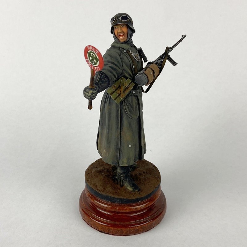 Miniatura en escala 1:16 (120 mm) que representa a un miembro de la Feldgendarmerie alemana realizando labores de control de tráfico militar durante la Segunda Guerra Mundial. La figura viste abrigo largo reglamentario, casco con gafas protectoras y porta subfusil MP40, sosteniendo el característico disco de señalización “Halt Polizei”, utilizado para detener vehículos y regular movimientos en carreteras militares.