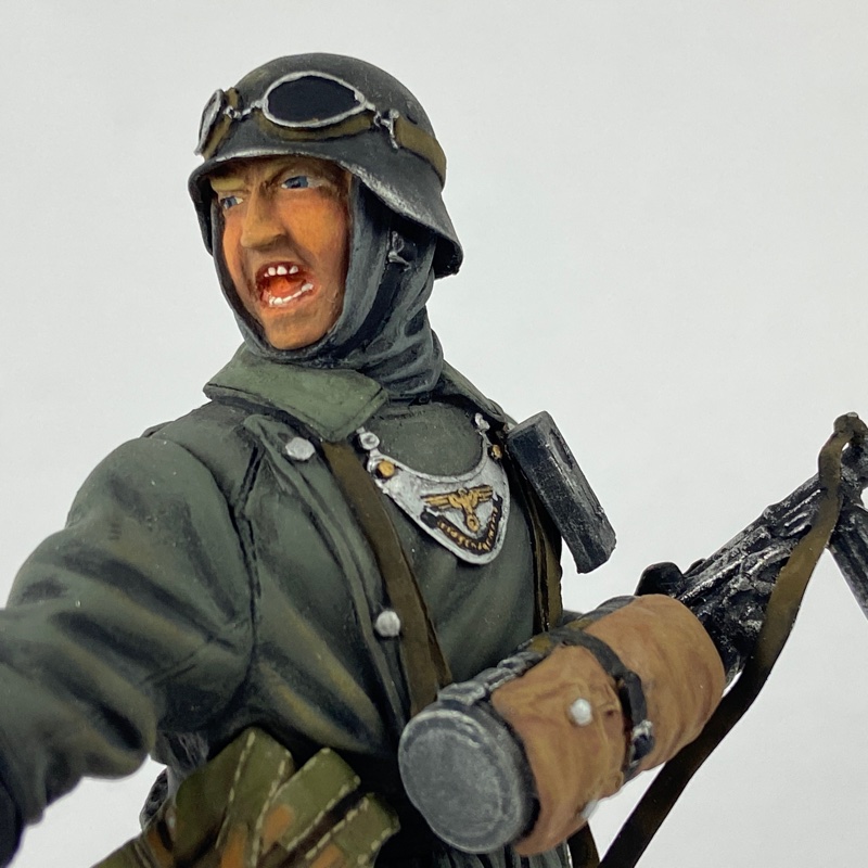 Miniatura fabricada en resina por Verlinden, con gran nivel de detalle y acabado pintado completamente a mano de alta calidad, destacando el realismo en el uniforme, armamento y base decorativa montada sobre peana de madera.