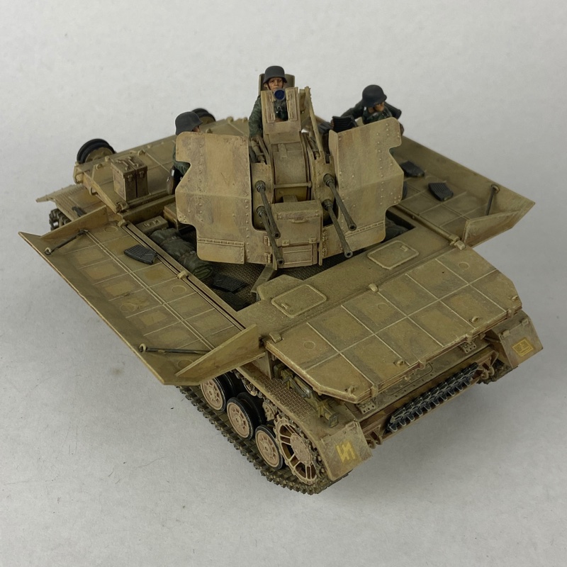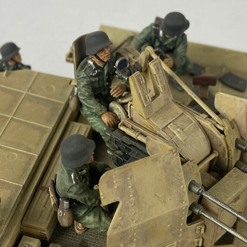 La pieza presenta buen nivel de detalle, incluyendo cañón antiaéreo central con escudos protectores, paneles laterales desplegables y elementos de municionamiento en la plataforma. Incorpora varias figuras de tripulación en posiciones de servicio y acabado envejecido que simula desgaste propio del uso en campaña.