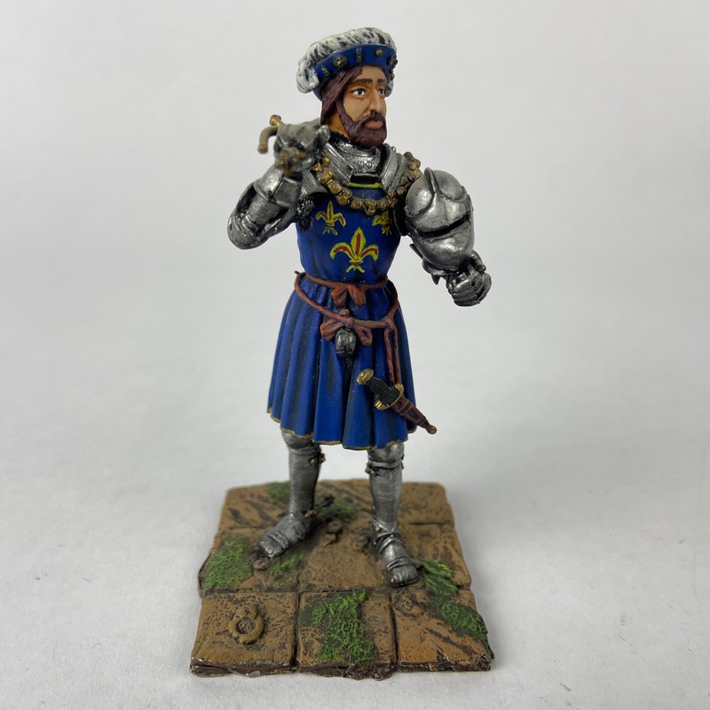 Se presenta montada sobre base escénica con pavimento simulado, pintada a mano con buen nivel de detalle en armadura, textiles y heráldica. Destaca especialmente la decoración del jubón con las flores de lis y el correcto estilo renacentista del conjunto, representando fielmente la imagen del monarca en campaña militar.
