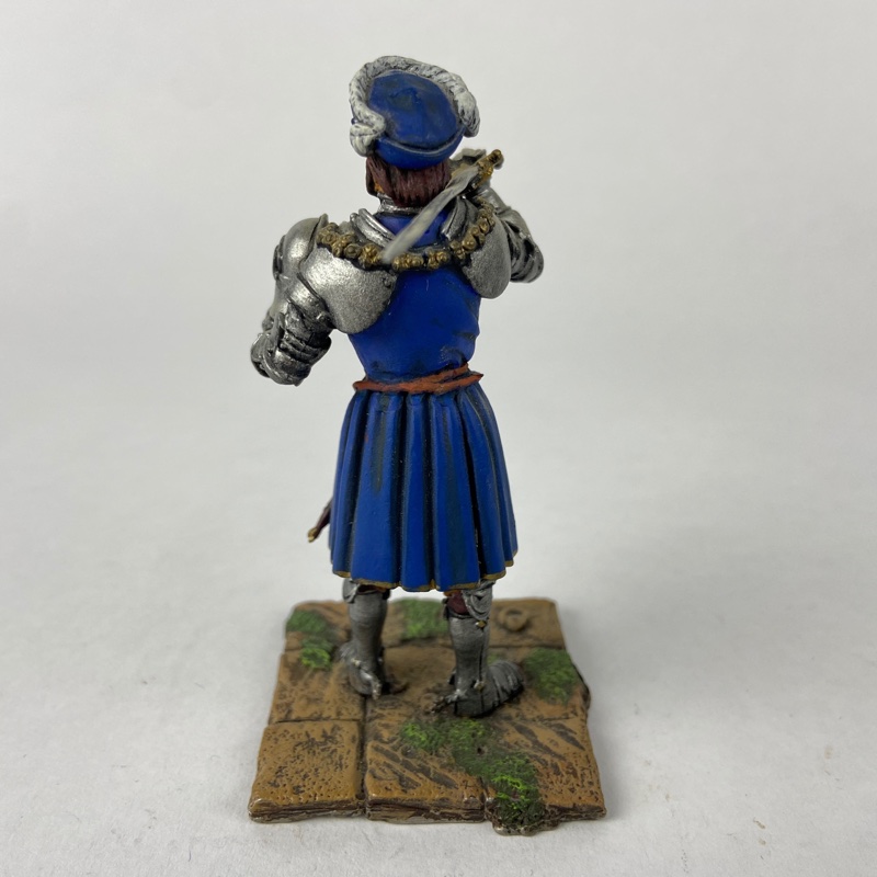 Miniatura a escala 80 mm (aprox. 1:22) que representa al rey Francisco I de Francia durante la Batalla de Marignano en 1515, uno de los enfrentamientos más importantes de las Guerras Italianas. Figura en metal de la firma Border Miniatures, esculpida por el reconocido artista Pete Armstrong.