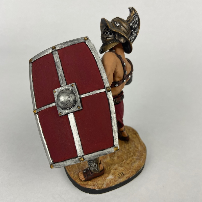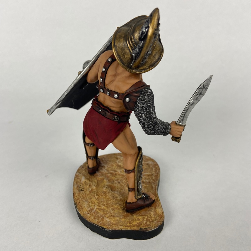 Miniatura a escala 1:16 o 120 mm aproximadamente, que representa a un gladiador tracio de la Antigua Roma, equipado con armamento característico de este tipo de combatiente. La figura viste casco tracio con amplia visera, cresta decorativa y protección facial perforada, protector de brazo en cota de malla, grebas en las piernas y faldellín rojo. Porta escudo rectangular y espada curva tipo falcata.