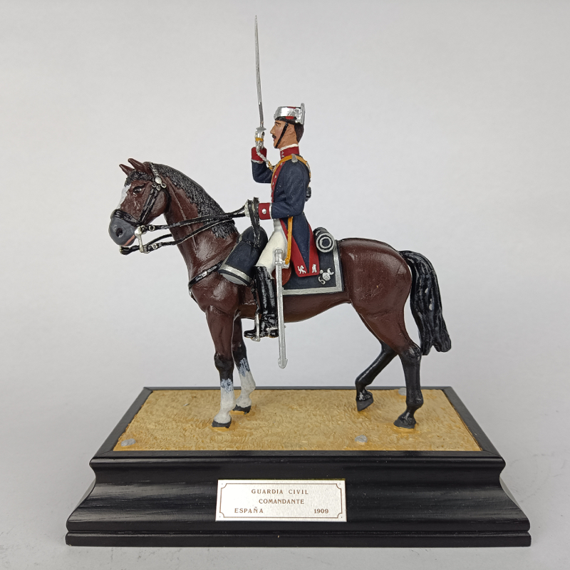 Miniatura a escala 1:20 o 90 mm aproximadamente, que representa a un comandante de la Guardia Civil montado a caballo, correspondiente a la uniformidad española del año 1909, tal como se indica en la placa identificativa de la peana. La figura viste uniforme reglamentario de caballería con guerrera en tonos azul oscuro y rojo, casco metálico característico y bandolera cruzada, portando sable en posición de saludo y equipo completo de servicio.