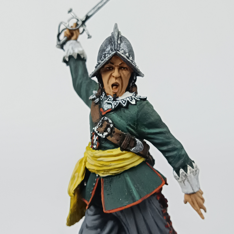 Miniatura a escala 90 mm (aprox. 1:20) que representa a un oficial de la Guerra Civil Inglesa del siglo XVII, período de los conflictos entre realistas y parlamentarios entre 1642 y 1651. Modelo en metal de la firma Pegaso Models, reconocida por su calidad escultórica y fidelidad histórica.