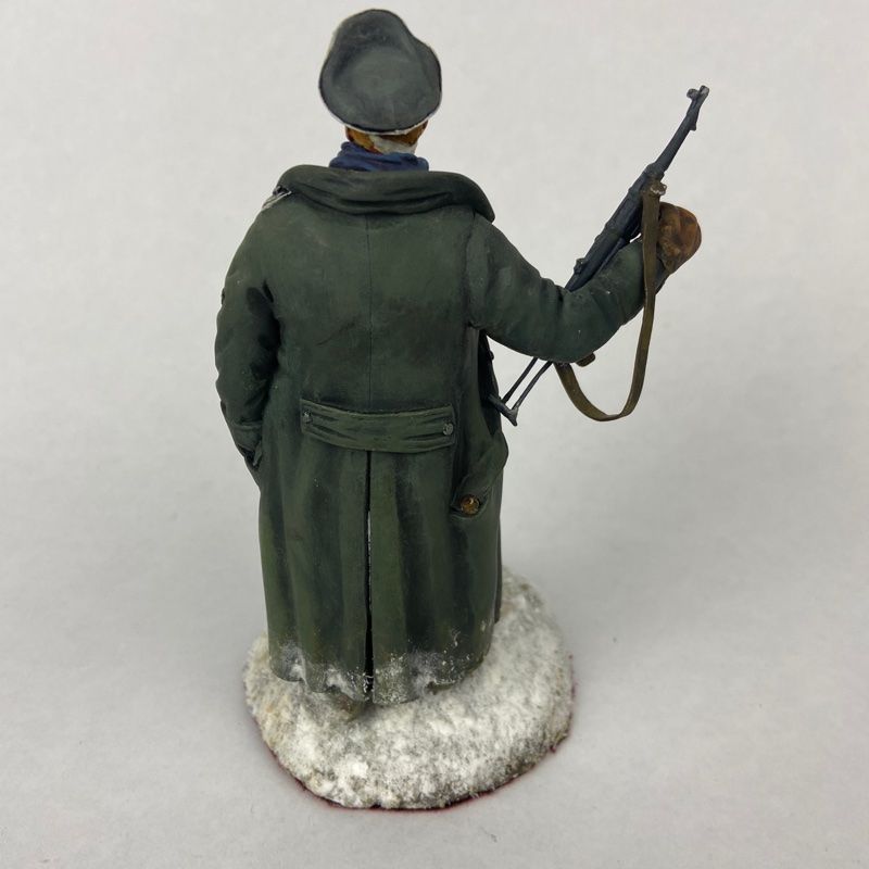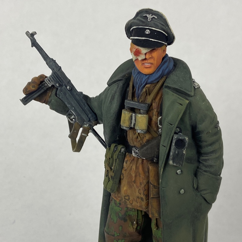 Miniatura a escala 120 mm que representa a un oficial alemán de las Waffen-SS en uniforme de invierno hacia 1943. Figura equipada con abrigo largo de campaña M40, prenda interior con camuflaje tipo Oak Leaf con guerrera de verano y pantalón de otoño; y subfusil MP-40. Muestra además vendaje en un ojo.