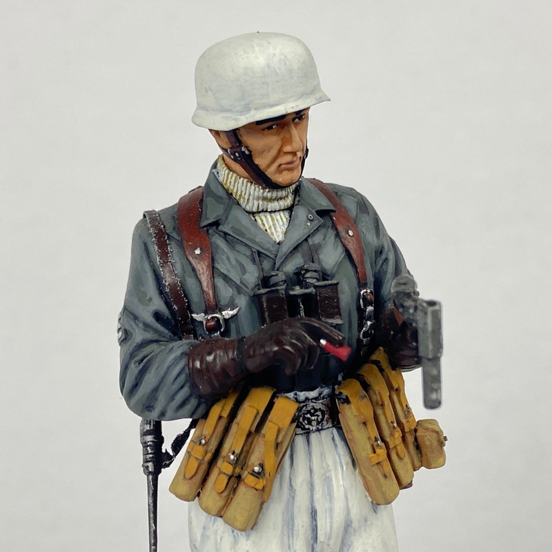 Destaca el buen nivel de detalle en el uniforme, equipo y armamento, así como el trabajo de pintura en los efectos de desgaste y sombreado del uniforme blanco invernal. Base decorada con terreno acorde al contexto operativo, tal como se aprecia en las fotografías.