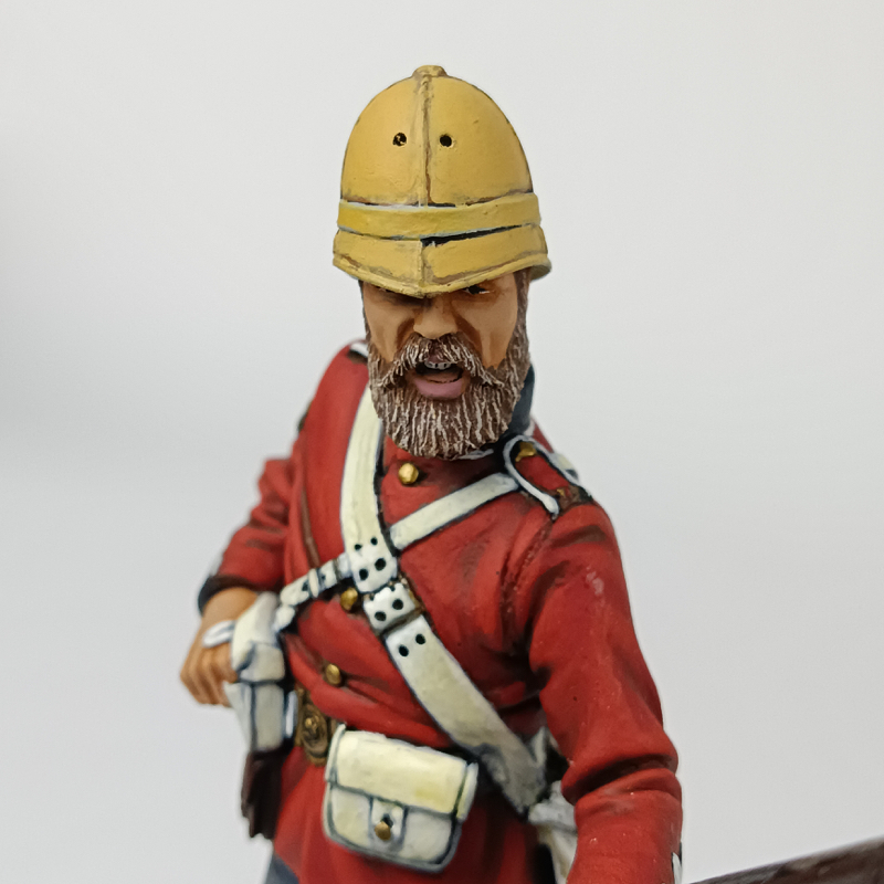 Miniatura a escala 120 mm (1:16) que representa a un sargento británico del 24º Regimiento de Infantería durante la Guerra Anglo-Zulú de 1879. La figura viste uniforme de campaña con guerrera roja, casco colonial tipo salakot y equipo reglamentario británico, portando fusil con correaje y cartucheras propias del periodo.