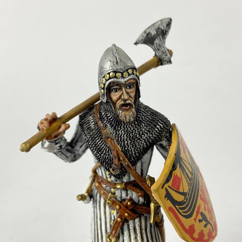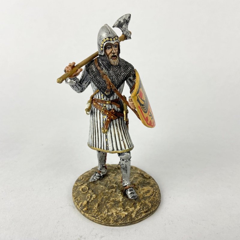 La figura muestra a un guerrero equipado con casco cónico decorado, cota de malla y sobrevesta de tela, vestimenta característica de nobles y jefes militares del ámbito escocés y gaélico. Porta escudo heráldico con decoración y empuña un hacha de guerra apoyada sobre el hombro, arma ampliamente utilizada por guerreros de tradición celta y escocesa. También se aprecian espada y equipo auxiliar al cinto, propios de combatientes de alto estatus. La base escénica representa terreno irregular propio de campo abierto.