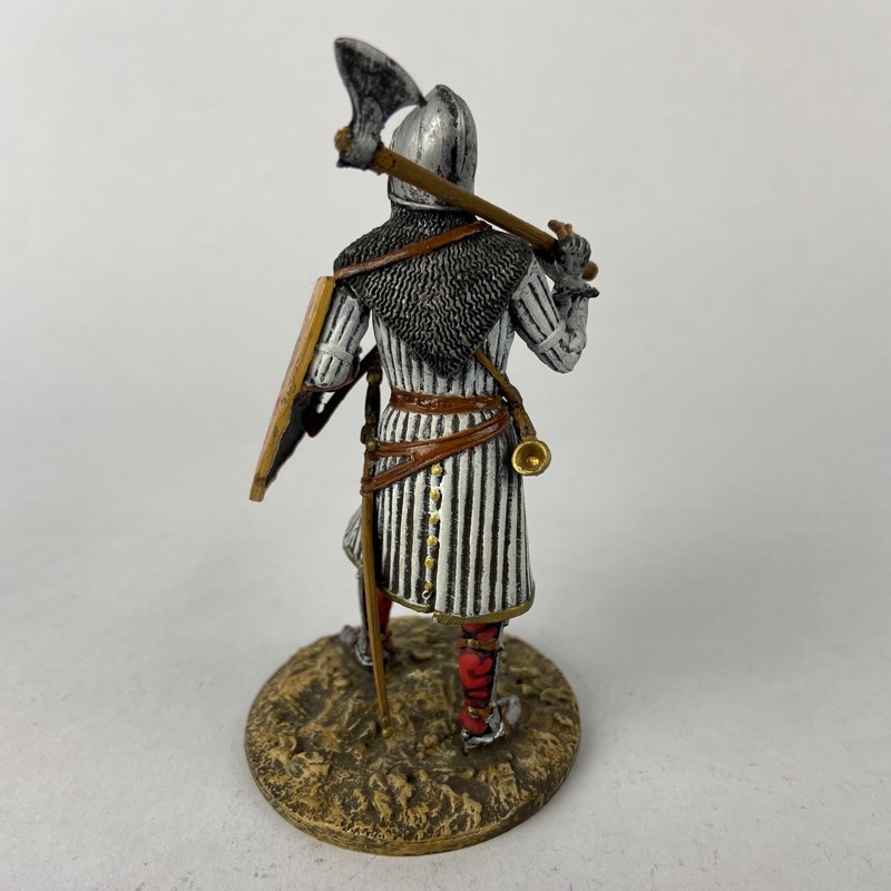 Destaca el buen nivel de acabado de la pintura realizada a mano, con especial atención en la textura de la cota de malla, los detalles del escudo heráldico y el tratamiento realista del metal en casco y armas. El conjunto presenta un acabado equilibrado que resalta el carácter histórico y representativo de la pieza.