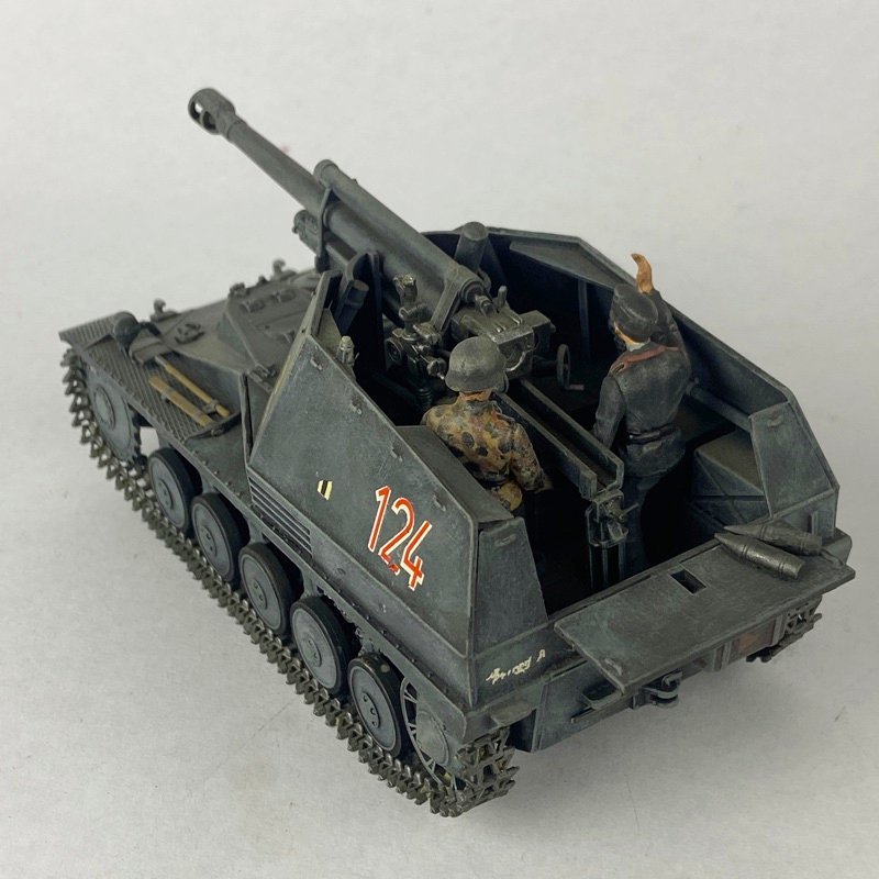 Miniatura a escala 1:35 del cañón autopropulsado alemán Sd.Kfz. 124 Wespe, correspondiente a la Segunda Guerra Mundial. Modelo representado en acabado color gris panzer, con numeración 124 y compartimento de combate abierto, característico de este vehículo de artillería ligera.