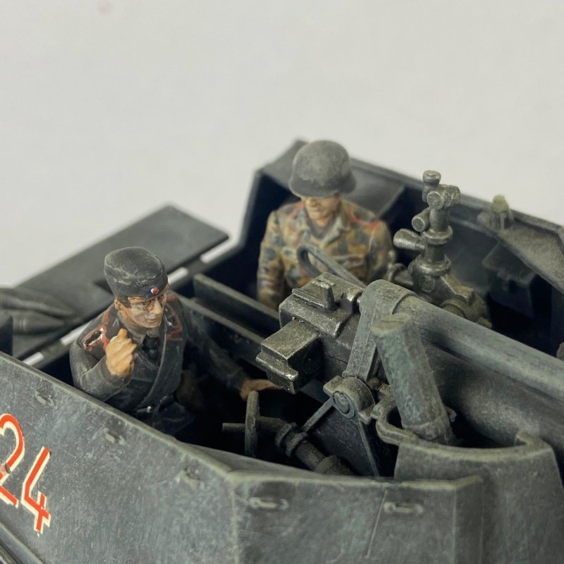 La pieza presenta buen nivel de detalle, incluyendo cañón principal montado en compartimento abierto, herramientas exteriores, rueda de repuesto frontal y elementos del sistema de suspensión. Incorpora figuras de tripulación visibles en el compartimento trasero, además de acabado envejecido que simula desgaste propio del uso en campaña.