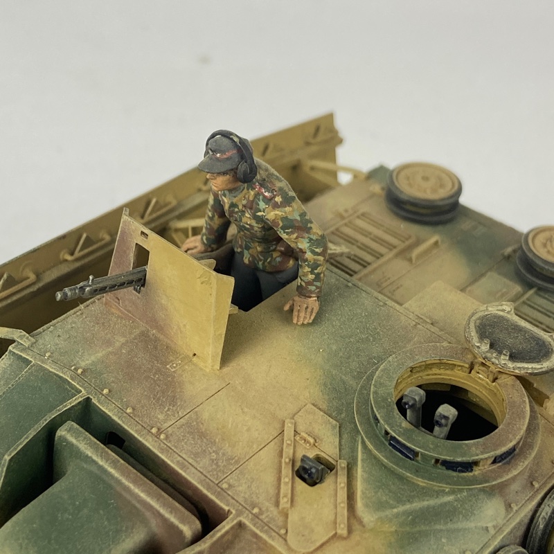 La pieza presenta buen nivel de detalle, incluyendo cañón largo frontal, herramientas exteriores, cable de arrastre trasero, ruedas de repuesto y faldones laterales completos. Incorpora figura de tripulante visible en la escotilla superior, además de acabado envejecido que simula desgaste propio del uso en campaña.