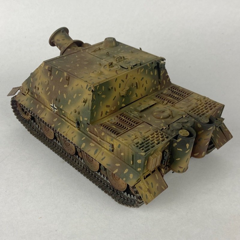 Miniatura a escala 1:35 del carro pesado alemán Sturmtiger (Sturmmörser Tiger), correspondiente a la Segunda Guerra Mundial. Modelo representado en acabado de camuflaje tricolor alemán con patrón moteado, característico de las últimas fases del conflicto, montado sobre chasis de Tiger I y equipado con su distintivo mortero frontal de 380 mm.