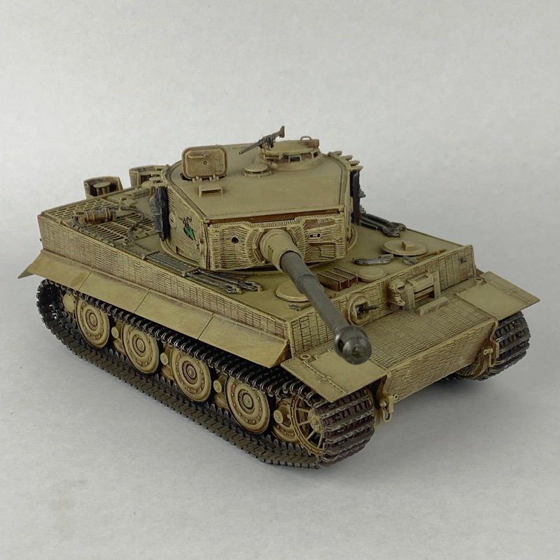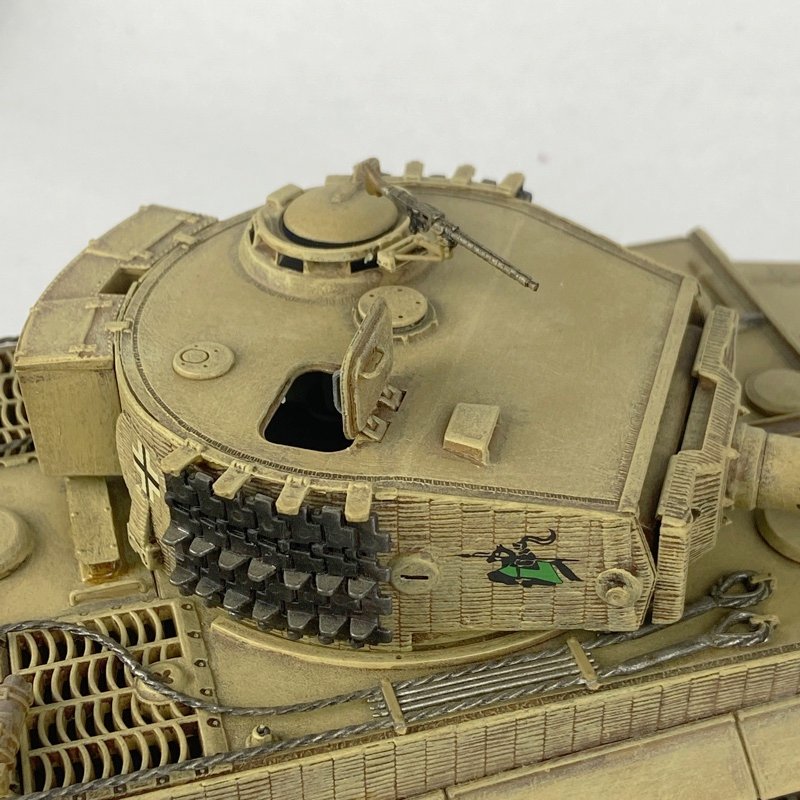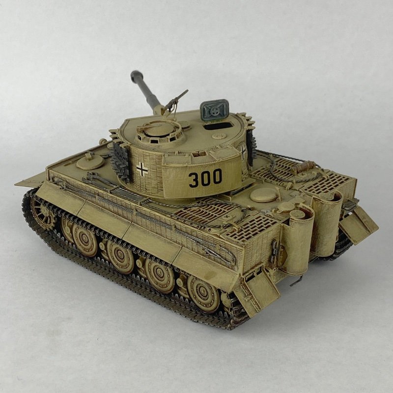 Miniatura a escala 1:35 del carro pesado alemán Tiger I (Panzerkampfwagen VI Ausf. E), correspondiente a la Segunda Guerra Mundial. Modelo representado en acabado color arena desértico, con numeración táctica 300 en la torreta y distintivo del 505 batallón de Carros de combate Pesados.