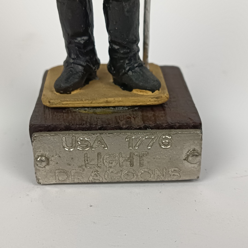Pintada a mano, con buen nivel de detalle en botones, correaje y tocado con penacho. Montada sobre base de madera con placa metálica grabada “USA 1776 Light Dragoons”.