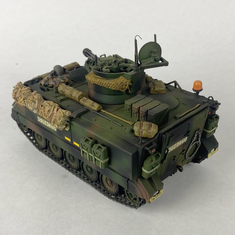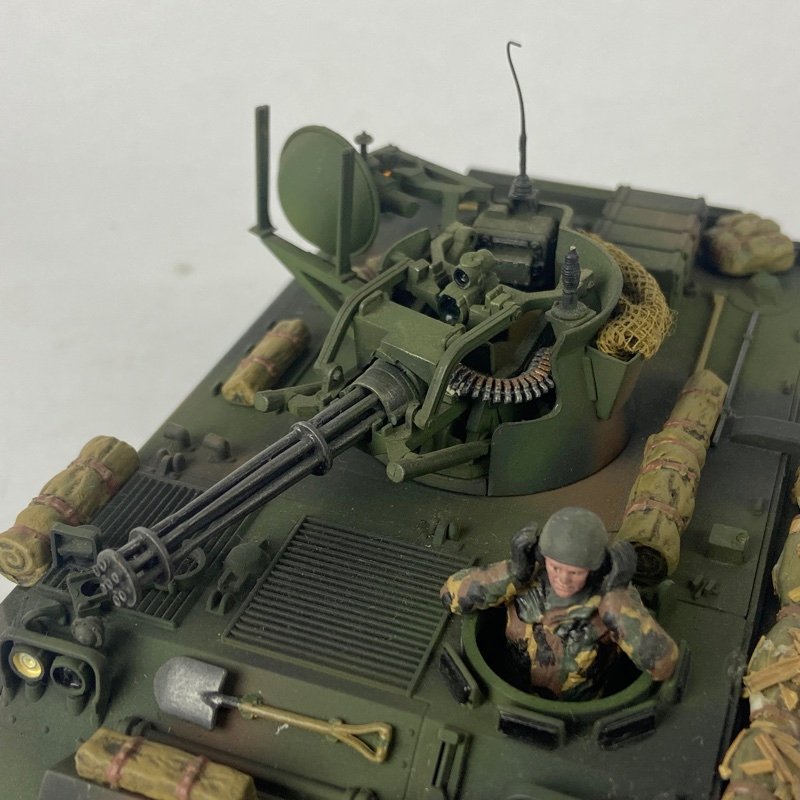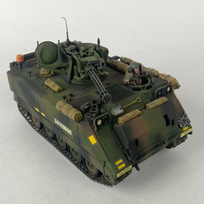 La pieza presenta buen nivel de detalle, incluyendo torreta equipada con cañón rotativo Vulcan de 20 mm, tren de rodaje característico del M113 y elementos exteriores propios del sistema antiaéreo. El modelo muestra acabado envejecido que simula desgaste propio del uso en servicio.