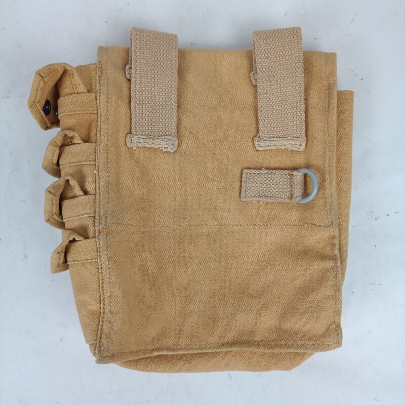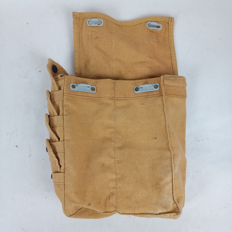Bolso lateral derecho formado por dos compartimentos separados para cargas explosivas. Bolsa lateral derecha, con un solo compartimento más grande, destinada a la máscara de gas. Cada bolsa lateral tiene trabillas para cinturón para asegurar el conjunto a la cintura. En el lateral incorpora cuatro bolsillos pequeños para clips de mauser.