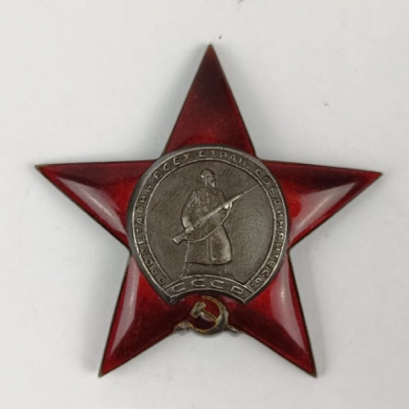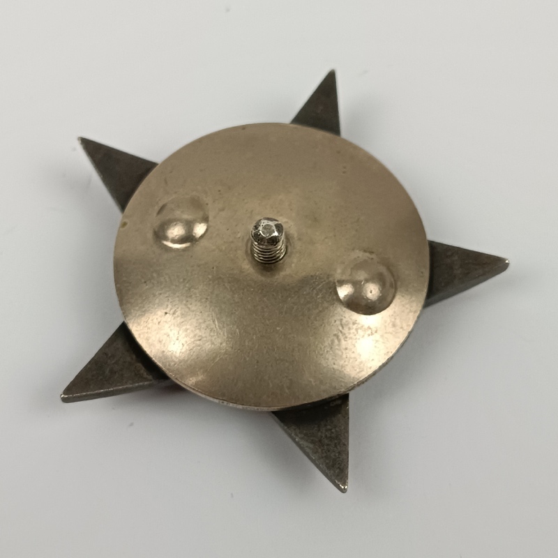 Estrella de 5 puntas, de plata con esmaltes al fuego de color rojo rubí en las puntas. En el centro presenta la figura de un soldado del Ejercito Rojo empuñando un rifle, rodeado por la inscripción en ruso “Proletarios del mundo, Uníos!”.