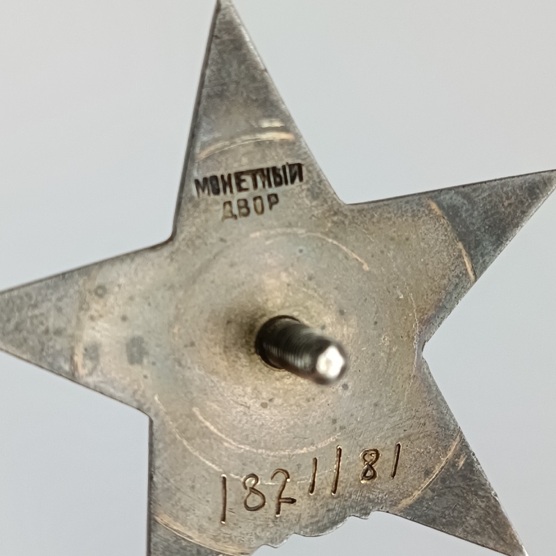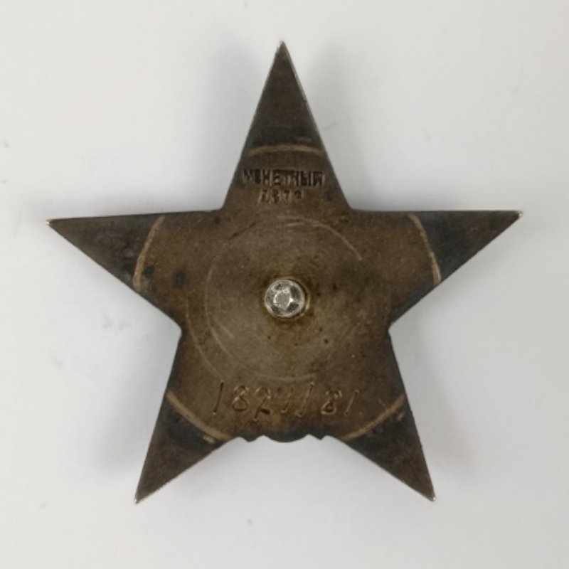 Orden de la Estrella Roja concedida durante la Segunda Guerra Mundial. Número de serie 1821181, primer modelo producido en la fábrica Platinpribor de Moscú (MZPP) con números de serie entre 1792001 y 195000.