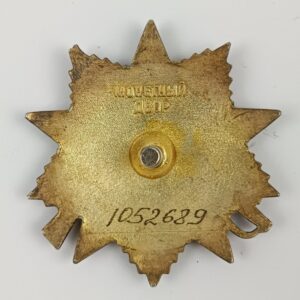 Orden de la Guerra Patria de 2 Clase, otorgada durante la Segunda Guerra Mundial. Modelo de construcción en dos piezas, con cuerpo de plata con esmaltes al fuego y hoz y martillo en el centro de oro, remachada a la parte posterior en dos puntos. La orden representa una estrella roja esmaltada con esmalte al fuego de color rojo intenso superpuesta sobre una estrella con ráfagas convexa. Lleva sobre el fondo un sable y un rifle cruzados. El centro lleva el símbolo de la hoz y el martillo rodeado por un cinturón de esmalte rojo sobre el que se lee “ОТЕЧЕСТВЕННАЯ ВОЙНА” (Guerra Patriótica). En el reverso lleva el marcaje “МОНЕТНЫЙ ДВОР” y el número de serie 863329. Tercer modelo con campo posterior liso, 2 variante. Establecida por Decreto del Presídium del Sóviet Supremo de la URSS el 20 de mayo de 1942.