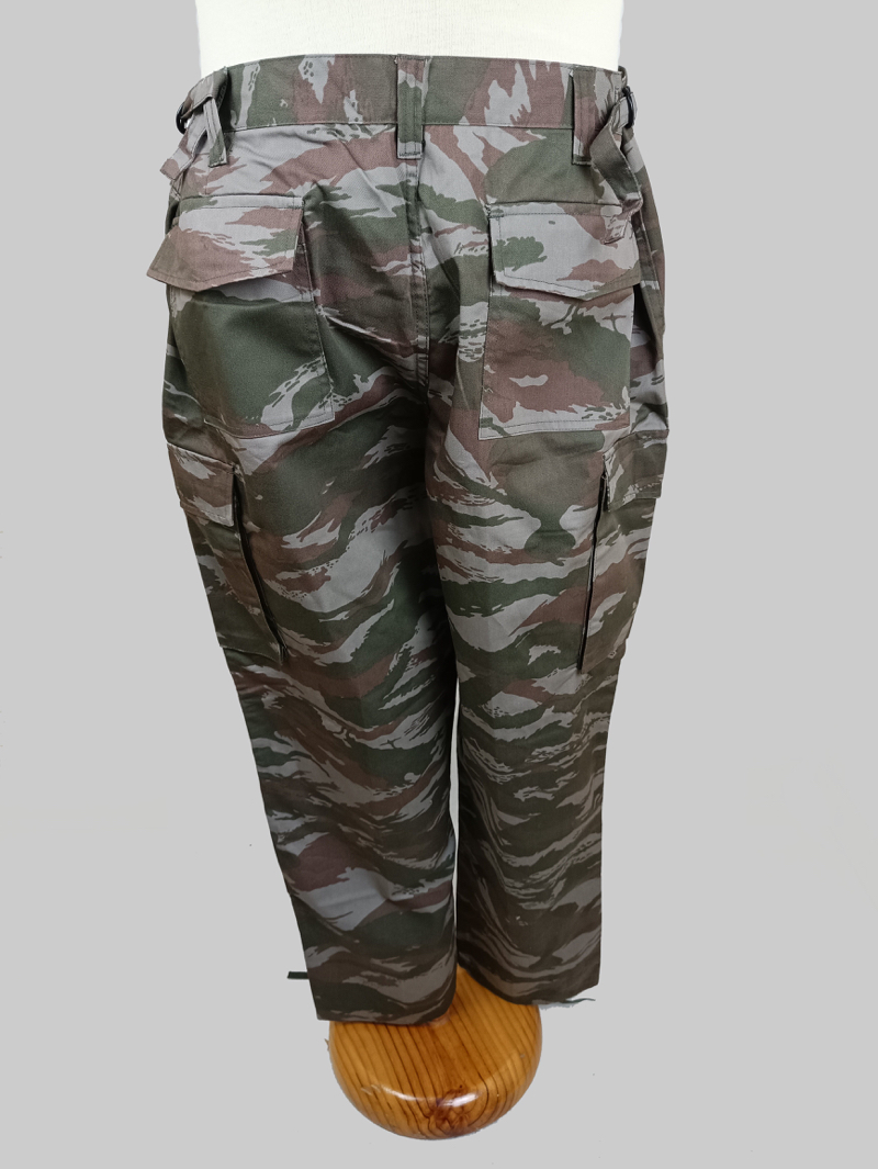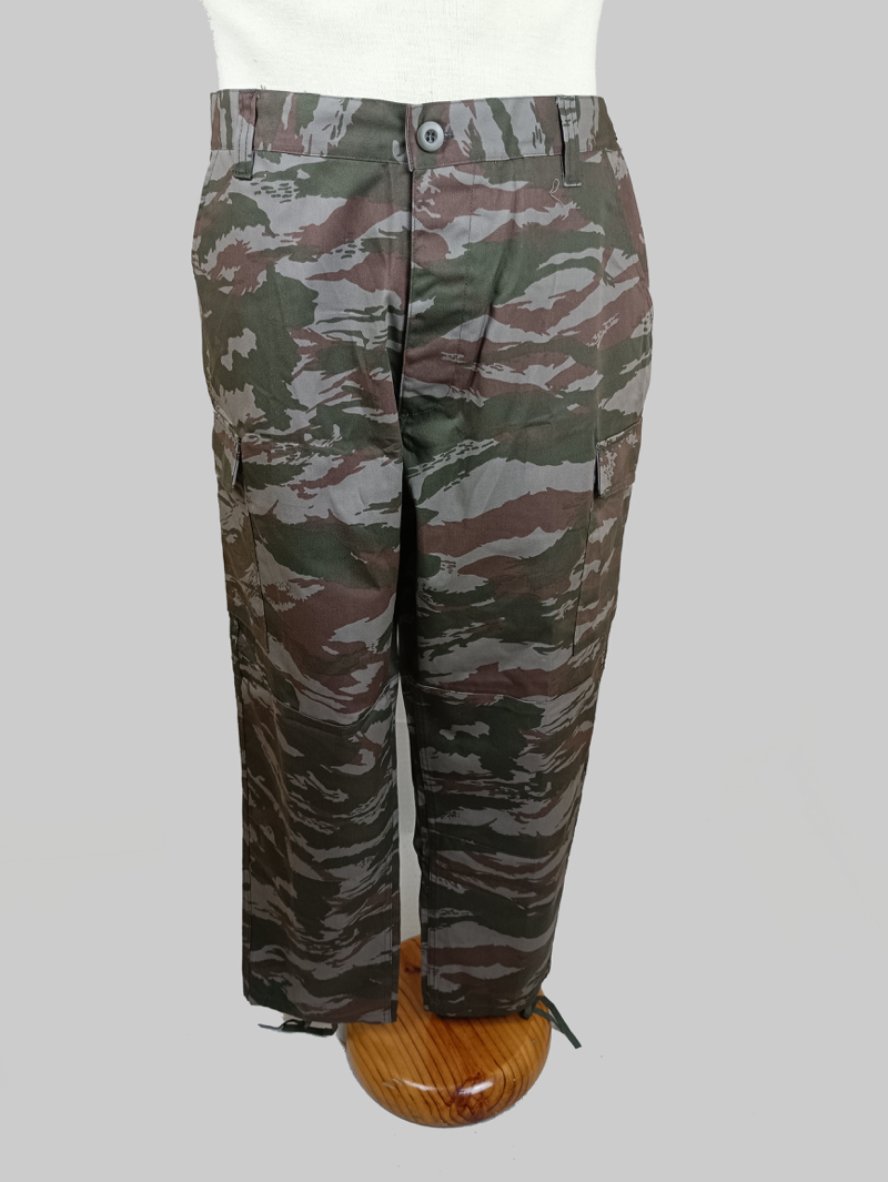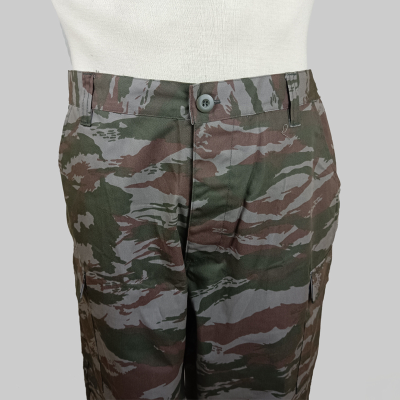 Pantalón de campaña perteneciente al uniforme utilizado por unidades de Tropas Especiales de las Fuerzas Armadas Revolucionarias de Cuba. Presenta el característico patrón de camuflaje tipo lagarto en tonos verde oscuro y marrón sobre fondo grisáceo.