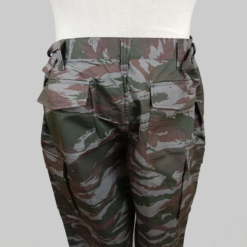 El pantalón sigue el corte militar de campaña con cierre frontal mediante botón, trabillas para cinturón, bolsillos delanteros, bolsillos traseros con solapa y bolsillos laterales de carga para transporte de equipo. Los bajos incorporan cordón de ajuste para su uso con botas.