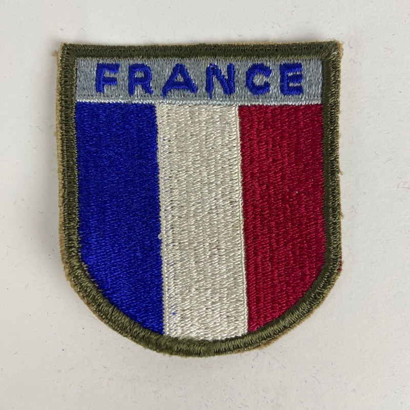 insignia de la Segunda Guerra Mundial, bordada a máquina, con los colores nacionales franceses (azul, blanco, rojo) y la palabra France en la zona superior. Utilizado por las tropas francesas libres entrenadas en Estados Unidos.
