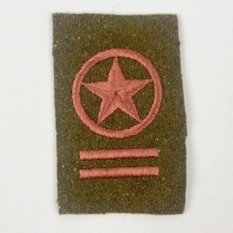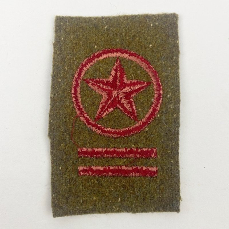 Bordado en hilo rojo sobre paño verde, presenta estrella de cinco puntas inscrita en círculo y dos barras horizontales en la parte inferior. Modelo reglamentario para uniforme de campaña, cosido directamente a la guerrera.