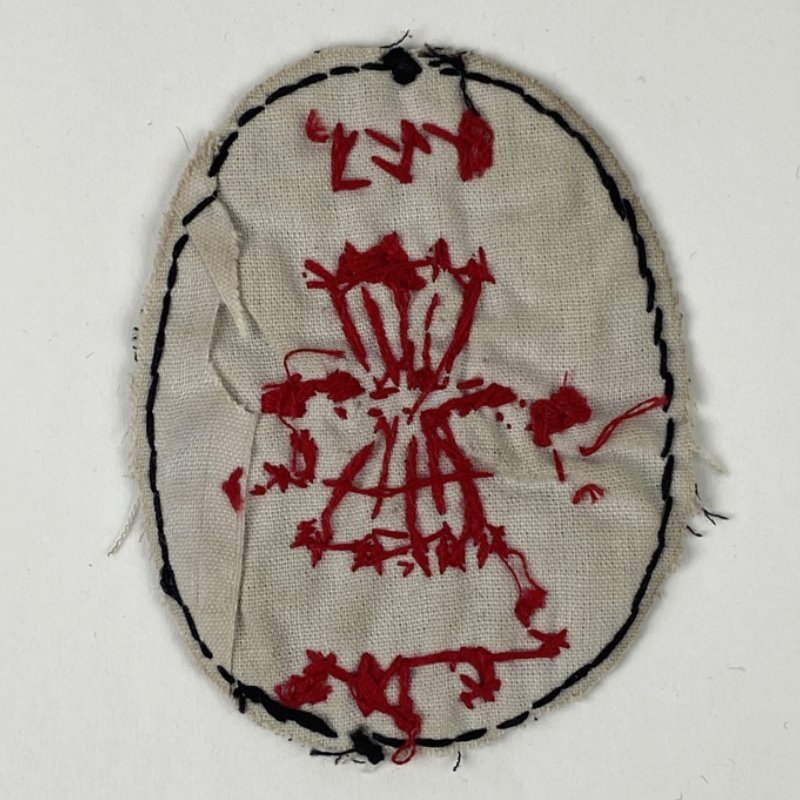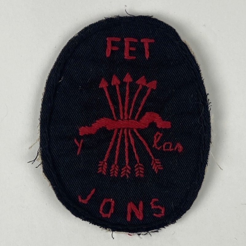 Parche ovalado bordado en hilo rojo sobre fondo negro con la inscripción FET y de las JONS y el emblema del yugo y las flechas en el centro.
