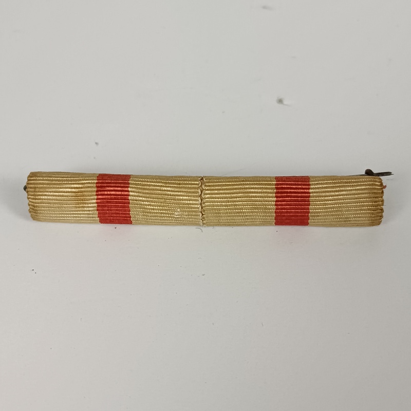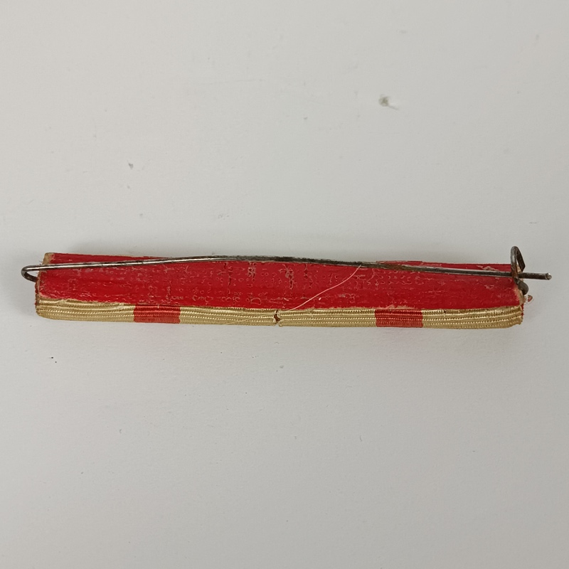 Las cintas originalmente blancas con franja roja central presentan una ligera variación de tono debido al desgaste natural del color por la antigüedad y el uso. Pieza original en buen estado general, con señales normales del paso del tiempo. Sistema de fijación mediante aguja en la parte posterior.
