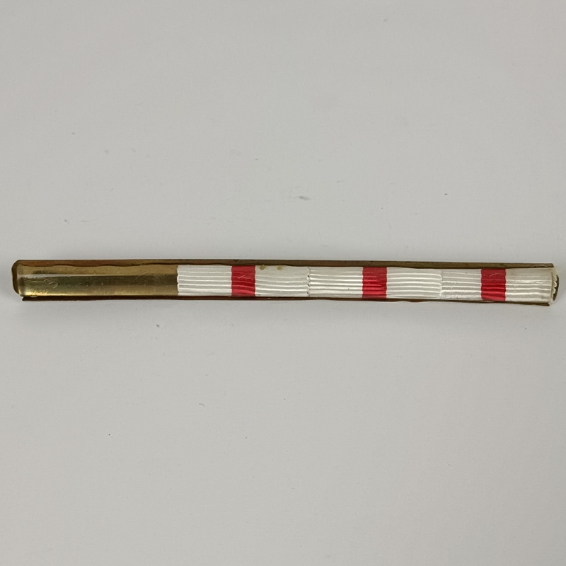 Cintas de color blanco con franja roja central característica de esta distinción. Conjunto original en buen estado de conservación, con desgaste normal por uso. Enganche mediante aguja en la parte posterior.