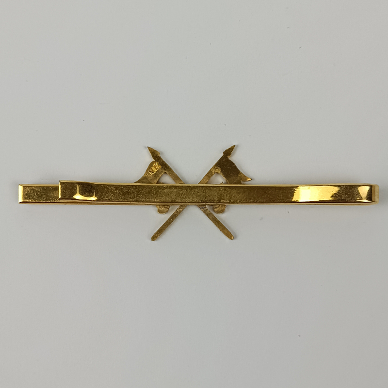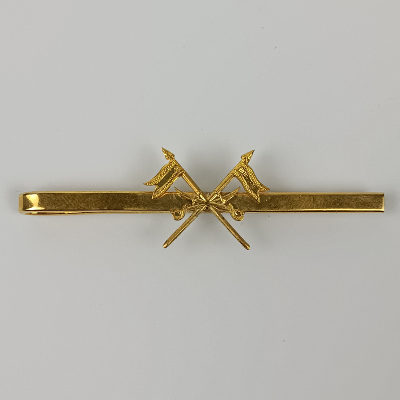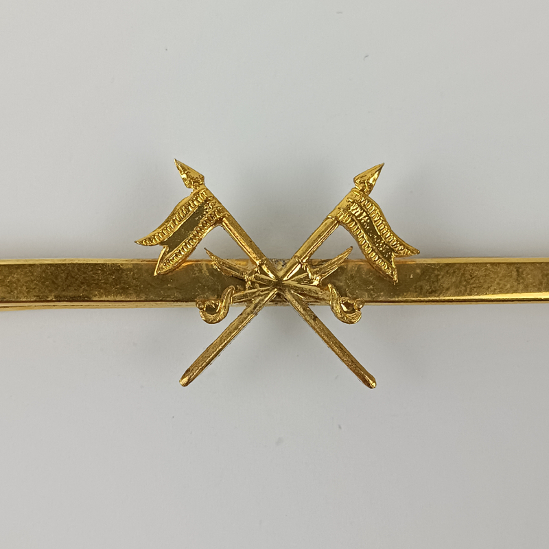 Pisacorbatas metálico dorado con el emblema del arma de Caballería del Ejército de Tierra, representado por lanzas cruzadas con banderolas características de esta especialidad. Fabricado en metal dorado con sistema de pinza en la parte posterior.