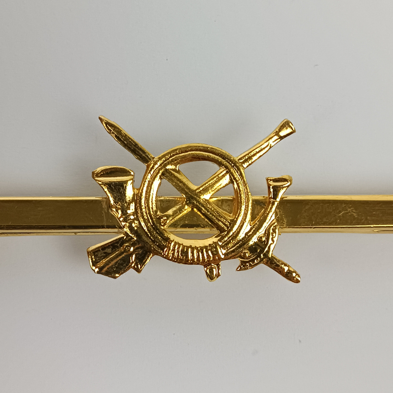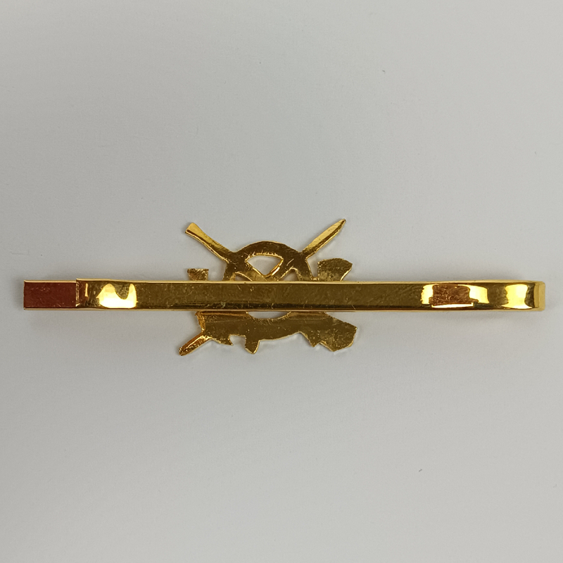 Pisacorbatas metálico dorado con el emblema del arma de Infantería del Ejército de Tierra en el centro, compuesto por el característico emblema con armas cruzadas y cornetas. Fabricado en metal dorado con sistema de pinza en la parte posterior.